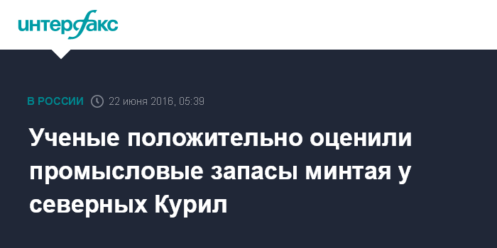 Москва. 22 июня. INTERFAX.RU - Запасы минтая в акватории возле северных Курил изучили ученые Сахалинского научно-исследовательского института рыбного хозяйства и океанографии (СахНИРО), сообщается на сайте института.