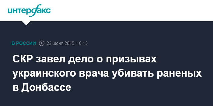 Москва. 22 июня. INTERFAX.RU - Следственный комитет РФ возбудил уголовное дело против украинского врача, подозреваемого в призывах к фактическому убийству пациентов, раненных в Донбассе и не желающих признавать киевские власти.
