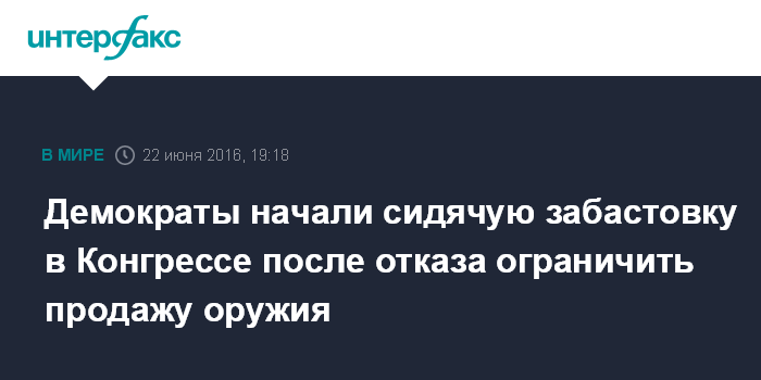 Москва. 22 июня. INTERFAX.RU - Представители Демократической партии США начали сидячую забастовку в Палате представителей после отказа Сената ограничить продажу оружия в стране. Об этом сообщается на сайте телеканала NBC.