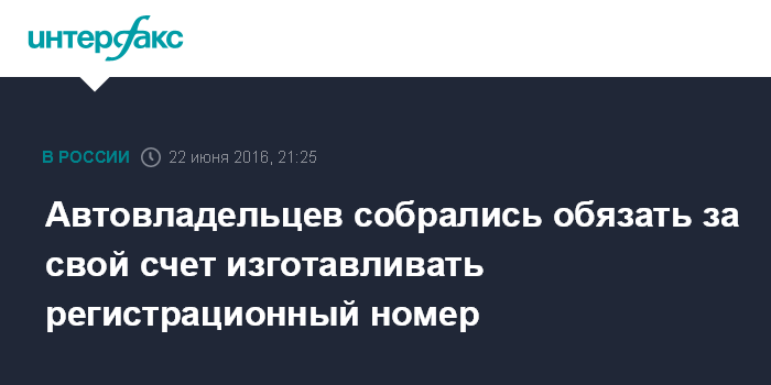 Москва. 22 июня. INTERFAX.RU - Законопроект о регистрации транспортных средств предусматривает изготовление регистрационного номера для машины за счет владельца, сообщил глава ГИБДД МВД России Виктор Нилов.