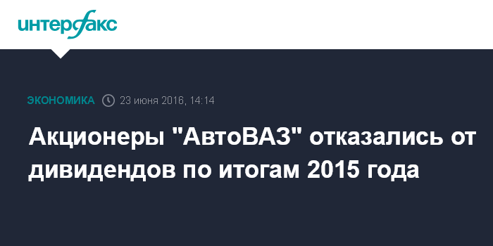 Москва. 23 июня. INTERFAX.RU - Акционеры ОАО "АвтоВАЗ" на годовом собрании в четверг проголосовали против выплаты дивидендов по итогам 2015 года, сообщил корреспондент "Интерфакса", присутствующий на собрании.