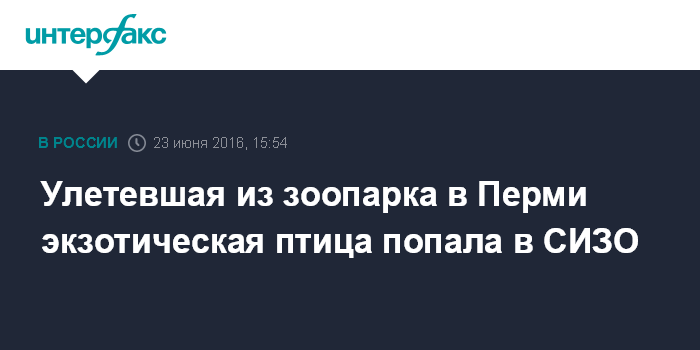 Москва. 23 июня. INTERFAX.RU - Сотрудники пермского следственного изолятора в одном из корпусов учреждения поймали экзотическую птицу, сообщается в пресс-релизе ГУФСИН России по Пермскому краю.
