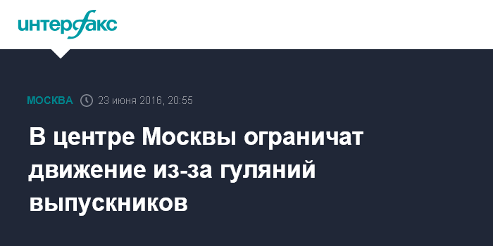 "В связи с проведением в Москве 24 и 25 июня выпускных вечеров и городского праздника выпускников будет временно ограничено движение транспортных средств: с 09:00 24 июня до 06:00 25 июня по Рыбному переулку; с 16:00 24 июня до 01:00 25 июня по улице Ильинка от Новой площади до Красной площади; с 16:00 24 июня до 06:00 25 июня по Ветошному переулку", - сказал сотрудник пресс-службы.