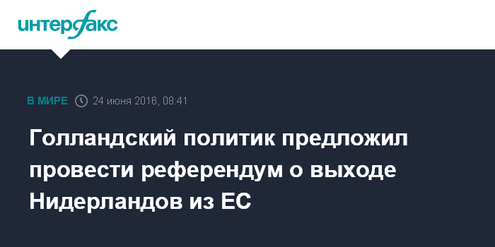 Москва. 24 июня. INTERFAX.RU - Лидер нидерландской Партии свободы Герт Вилдерс в пятницу предложил провести референдум о выходе Нидерландов из ЕС.