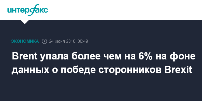 Москва. 24 июня. INTERFAX.RU - Нефть упала более чем на 6% на данных о победе сторонников Brexit на прошедшем в четверг в Великобритании референдуме.