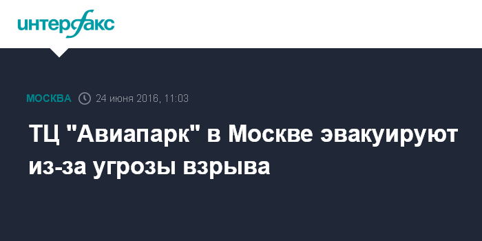 Москва. 24 июня. INTERFAX.RU - Около тысячи человек эвакуируют из торгового центра "Авиапарк" на севере Москвы после анонимного сообщения о заложенном в нем взрывном устройстве, сообщил "Интерфаксу" источник в правоохранительных органах.