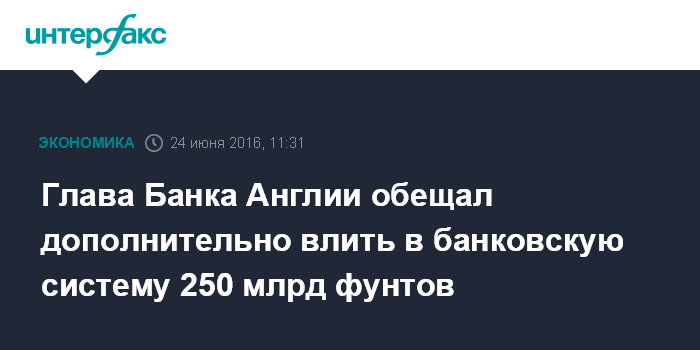 Москва. 24 июня. INTERFAX.RU - Банк Англии готов предоставить британским банкам дополнительные 250 млрд фунтов стерлингов (почти $350 млрд) в случае необходимости и продолжит сотрудничество с другими центральными банками, заявил в пятницу глава ЦБ Марк Карни в телевизионном обращении к нации.