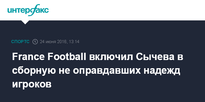 Москва. 24 июня. INTERFAX.RU - Бывший нападающий сборной России по футболу Дмитрий Сычев по версии издания France Football вошел в символическую сборную "ложных звезд", то есть, игроков, не оправдавших ожидания.