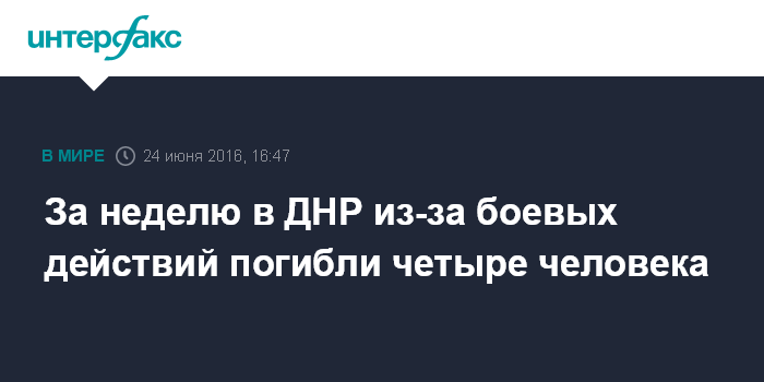 Москва. 24 июня. INTERFAX.RU - За неделю в самопровозглашенной Донецкой народной республике (ДНР) в результате боевых действий погибли четыре человека, двое из них - под обстрелами.