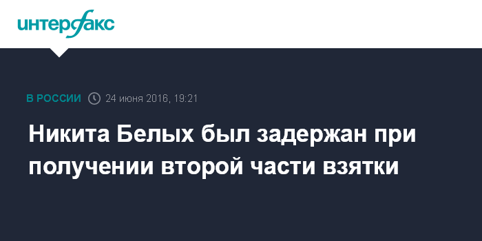 Белых был сегодня задержан с поличным при получении взятки в одном из ресторанов Москвы. По версии следствия, он лично и через посредника получил взятки в особо крупном размере на общую сумму 400 тыс. евро (что соответствует 24,1 млн рублей) за совершение действий в пользу взяткодателя и контролируемых им АО "Нововятский лыжный комбинат" и ООО "Лесохозяйственная управляющая компания", а также за общее покровительство и попустительство по службе при осуществлении правительством Кировской области контроля за ходом реализации предприятиями инвестиционных проектов и ведении предпринимательской деятельности на территории области.