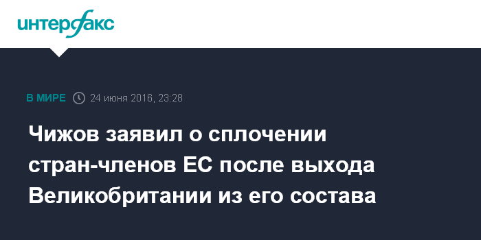 "Как это ни покажется парадоксальным, я не исключаю, что выход Великобритании не только не развалит Евросоюз, но приведет к его некоторому укреплению в составе оставшихся стран. Посмотрим. Во всяком случае, если кто-то думает, что сегодняшний день - это начало быстрого конца Евросоюза, по моему мнению, так рассуждать было бы несколько наивно", - заключил Чижов.