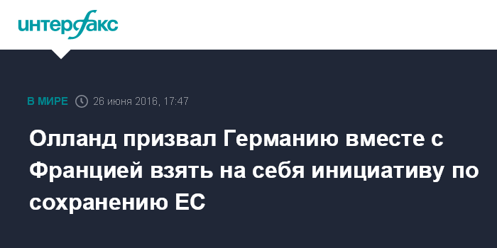 Москва. 26 июня. INTERFAX.RU - После решения британцев о выходе из ЕС, инициативу по подержанию единства Евросоюза должны взять в свои руки Франция и Германия, заявил французский президент Франсуа Олланд в воскресенье.