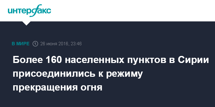 Москва. 26 июня. INTERFAX.RU - В Минобороны РФ заявляют, что уже 164 населенных пункта в Сирии присоединились к режиму перемирия.