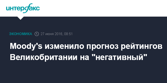 Москва. 27 июня. INTERFAX.RU - Международное рейтинговое агентство Moody's Investors Service изменило прогноз суверенных рейтингов Великобритании со "стабильного" на "негативный" после решения британцев на референдуме отказаться от членства в Европейском союзе (Brexit).