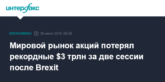 Москва. 28 июня. INTERFAX.RU - Мировой фондовый рынок потерял три триллиона долларов (более четырех процентов) капитализации за две торговые сессии после британского референдума, на котором жители страны проголосовали за выход из Европейского союза (Brexit). По данным Financial Times, такое падение является рекордным.