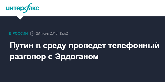 Москва. 28 июня. INTERFAX.RU - Президент РФ Владимир Путин в среду проведет телефонный разговор с президентом Турции Реджепом Эрдоганом, сообщил пресс-секретарь президента РФ Дмитрий Песков.