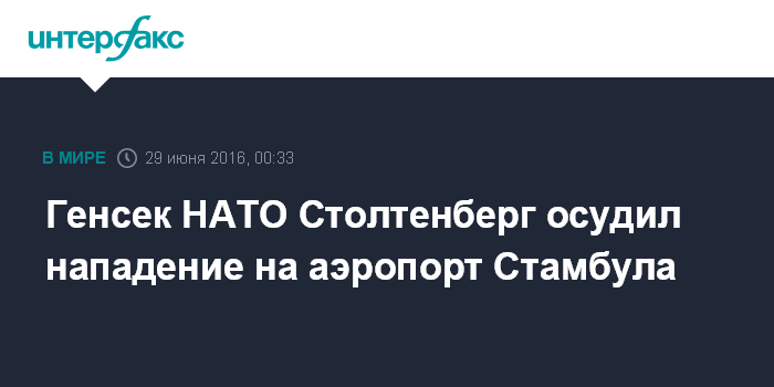 Москва. 29 июня. INTERFAX.RU - Генеральный Секретарь НАТО Йенс Столтенберг в среду выразил поддержку Турции в связи со взрывами в международном аэропорту Стамбула.