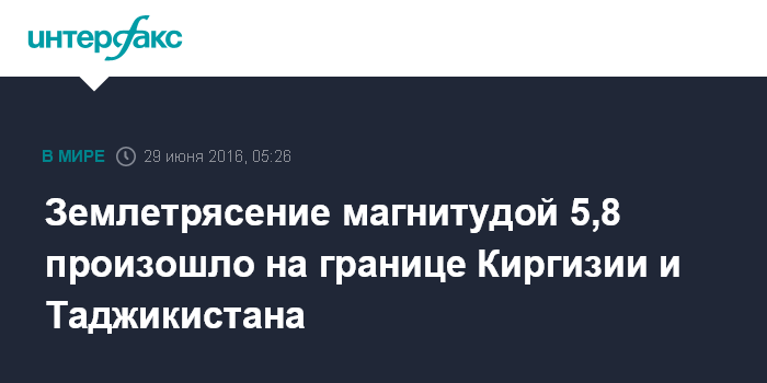 Москва. 29 июня. INTERFAX.RU - В приграничном районе Киргизии и Таджикистана в ночь на среду произошло землетрясение магнитудой 5,8, сообщила сейсмологическая опытно-методическая экспедиция комитета по науке Минобразования Казахстана.