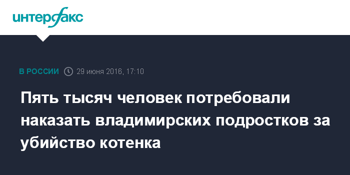 Москва. 29 июня. INTERFAX.RU - Более пяти тысяч интернет-пользователей подписали петицию с требованием привлечь к уголовной ответственности 15-летних подростков из Владимирской области, которые выложили в интернет видео с жестоким убийством котенка.