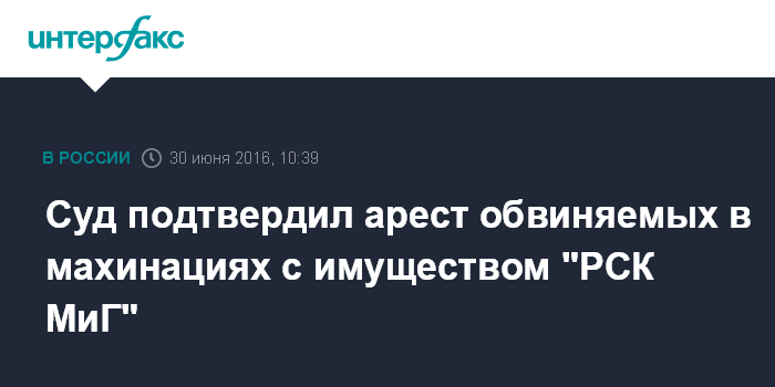 Москва. 30 июня. INTERFAX.RU - Басманный суд Москвы отправил под арест бывшего гендиректора ОАО "Миг-Рост" Алексея Озерова и замгендиректора ПАО "Туполев" по имущественному комплексу Егора Носкова, обвиняемых в мошенничестве с недвижимостью Российской самолетостроительной корпорации МиГ (РСК МиГ), и апелляционная инстанция оставила это решение в силе.