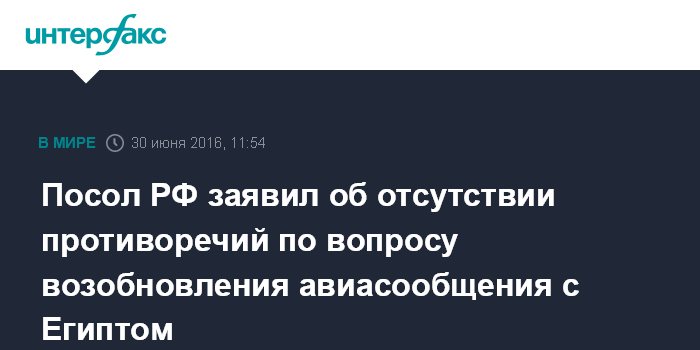 Москва. 30 июня. INTERFAX.RU - Принципиальных противоречий между Москвой и Каиром по вопросу возобновления авиасообщения и турпотока нет, заявил посол РФ в Египте Сергей Кирпиченко.