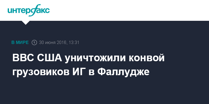 Москва. 30 июня. INTERFAX.RU - Свыше 500 автомобилей и десятки боевиков "Исламского государства" (организация, запрещенная в России) пытавшихся покинуть иракский город Фаллуджу, уничтожены в результате ударов авиации США, сообщил в четверг американский телеканал CNN со ссылкой на иракского чиновника.