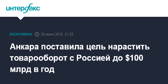 Москва. 30 июня. INTERFAX.RU - Анкара рассчитывает нарастить товарооборот с Россией до 100 млрд долларов в год, заявил глава МИД Турции Мевлют Чавушоглу.