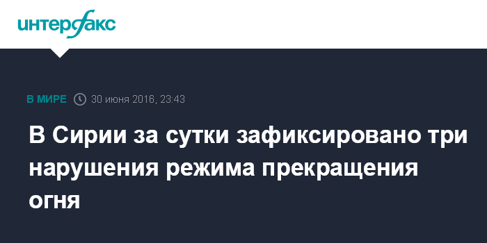 Москва. 30 июня. INTERFAX.RU - В Сирии за минувшие сутки зафиксировано три нарушения режима прекращения огня в провинции Дамаск, информирует российский Центр по примирению враждующих сторон на территории Сирийской Арабской республики.