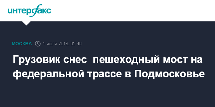 Москва. 1 июля. INTERFAX.RU - Пешеходный мост на 49 км трассы М-10 в Солнечногорском районе Московской области обрушился после того, как его задел кузовом грузовик, сообщает областное ГУ МЧС России.