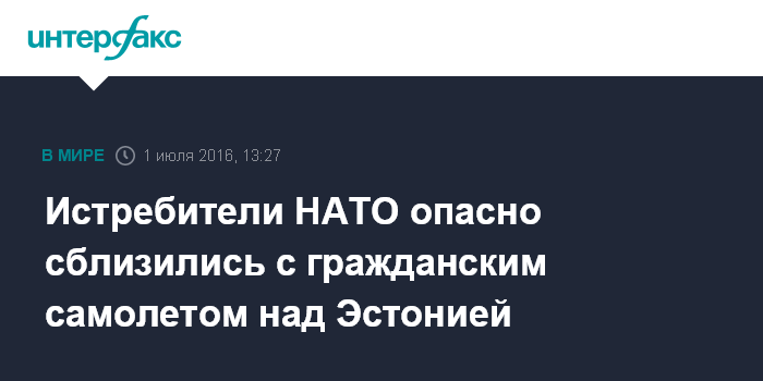 Москва. 1 июля. INTERFAX.RU - Опасное сближение самолетов НАТО, выполняющих бреющие полеты, с гражданским самолетом произошло в воздушном пространстве Эстонии.