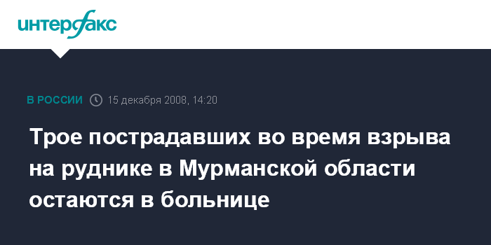 Москва. 15 декабря. INTERFAX.RU - В городской больнице города Кировск (Мурманская область) остаются трое горняков, пострадавших в результате взрыва на Расвумчоррском руднике, сообщили "Интерфаксу" в отделении травматологии.