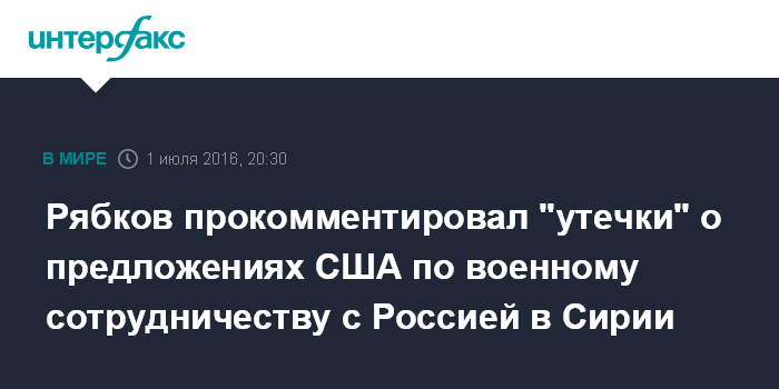 Москва. 1 июля. INTERFAX.RU - Заместитель министра иностранных дел России Сергей Рябков прокомментировал в пятницу "Интерфаксу" появившуюся в американских СМИ информацию о том, что Вашингтон якобы направил Москве проект соглашения по военному сотрудничеству в Сирии в обмен на обязательство РФ оказать давление на Дамаск с тем, чтобы тот не наносил удары по умеренной оппозиции в Сирии.