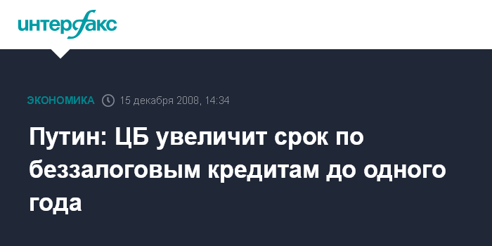 Москва. 15 декабря. INTERFAX.RU - Центробанк увеличит срок по беззалоговым кредитам до одного года, заявил премьер-министр РФ Владимир Путин, выступая на заседании президиума правительства в понедельник.