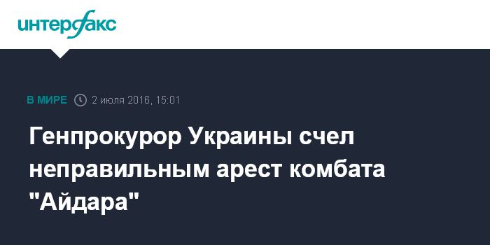 Москва. 2 июля. INTERFAX.RU - Генеральный прокурор Украины Юрий Луценко заявил, что не согласен с мерой пресечения в виде ареста командиру батальона территориальной обороны "Айдар" Валентину Лыхолиту.