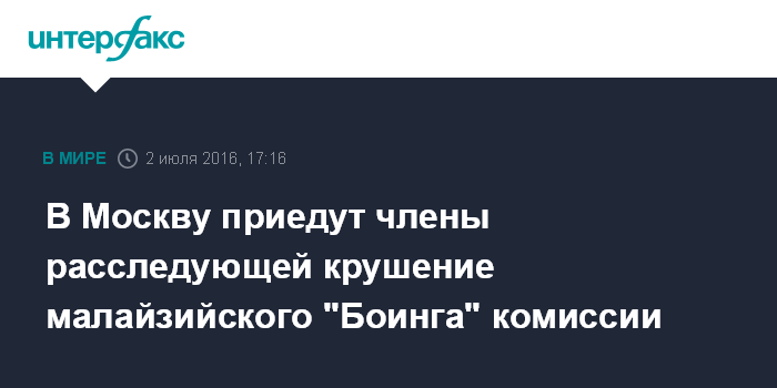 Москва. 2 июля. INTERFAX.RU - Вскоре в Москву приедут члены международной следственной группы, изучающие обстоятельства крушения малайзийского "Боинга" на востоке Украины 17 июля 2014 года, сообщил глава российской делегации Николай Ковалев. При этом он сослался на выступление руководителя голландской делегации на сессии Парламентской ассамблеи ОБСЕ в Тбилиси.