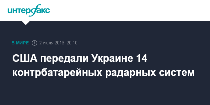 Москва. 2 июля. INTERFAX.RU - США передали Украине четыре контрбатарейные радарные системы AN/TPQ-36 и 10 систем AN/TPQ-49. Церемония передачи состоялась в международном аэропорту "Борисполь" (Киевская область) при участии президента Украины Петра Порошенко и посла США в Киеве Джеффри Пайетта.