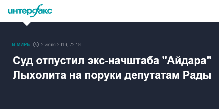 Москва. 2 июля. INTERFAX.RU - Апелляционный суд Киева отпустил экс-начштаба батальона "Айдар" Валентина "Бати" Лыхолита на поруки депутатов Верховной Рады, заявил председательствующий на заседании судья.