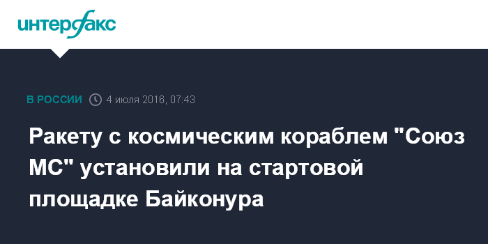 Старт первого пилотируемого корабля новой модификации "Союз МС" с экипажем очередной длительной экспедиции на МКС запланирован в 04:36 мск 7 июля 2016 года с площадки № 1 ("Гагаринский старт") космодрома Байконур.