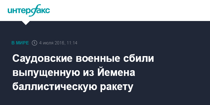Москва. 4 июля. INTERFAX.RU - ВВС Саудовской Аравии удалось сбить баллистическую ракету, запущенную с территории Йемена, сообщают в понедельник местные СМИ.