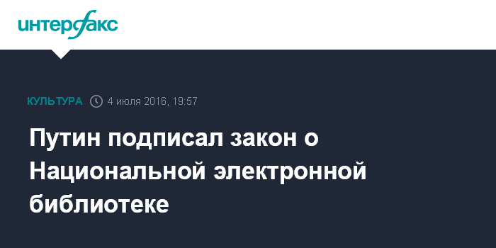 Москва. 4 июля. INTERFAX.RU - Президент РФ Владимир Путин подписал закон о создании в Российской Федерации Национальной электронной библиотеки. Текст документа опубликован в понедельник на официальном портале правовой информации.