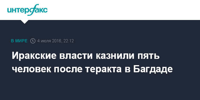 Москва. 4 июля. INTERFAX.RU - Власти Ирака привели в исполнение смертные приговоры в отношении пяти человек после теракта в столице Ирака Багдаде, который привел к гибели более 200 человек, сообщает сайт ливанского издания The Daily Star со ссылкой на заявление иракского министерства юстиции. Согласно заявлению, эти казни должны были показать родственникам погибших в результате теракта, что "братья в министерстве юстиции продолжают справедливо наказывать тех, чьи руки замараны в крови иракцев".