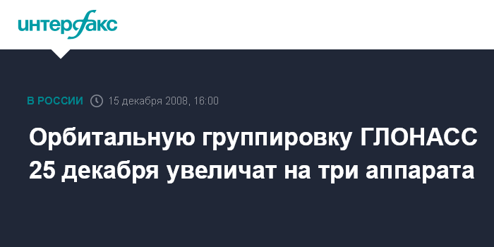 Москва. 15 декабря. INTERFAX.RU - Роскосмос утвердил дату и время запуска с космодрома Байконур ракеты-носителя "Протон-М" с тремя спутниками "Глонасс-М". "Запуск планируется на 13:43 мск 25 декабря 2008 года", - говорится в сообщении, опубликованном на сайте Роскосмоса.