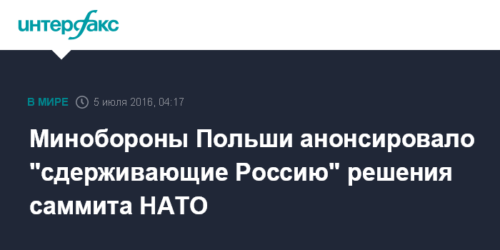 Москва. 5 июля. INTERFAX.RU - Решения, которые планируются принять на предстоящем 8 - 9 июля варшавском саммите НАТО, будут серьезным сдерживающим фактором для России, считает министр обороны Польши Антоний Мачеревич.