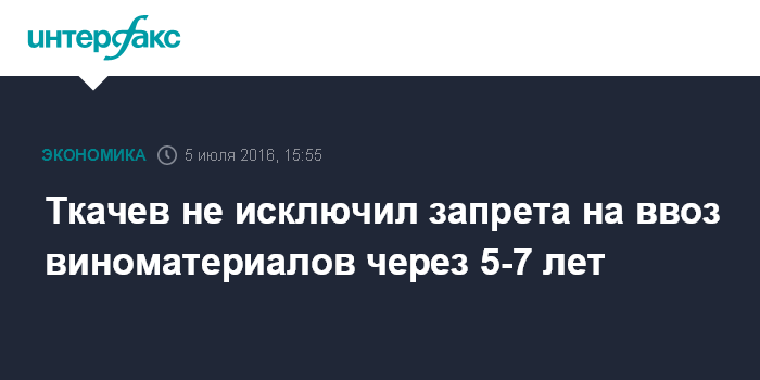 "Есть предложение, которое, как мне кажется, очень своевременно, и вы давали поручение", - заявил Ткачев, обращаясь к председателю правкомиссии, премьер-министру РФ Дмитрию Медведеву. "Мы готовим проект постановления о том, чтобы с одной стороны, увеличить пошлину или, с другой стороны - дать сигнал инвесторам, что через 5-7 лет мы закроем полностью завоз виноматериалов в РФ", - сказал он.