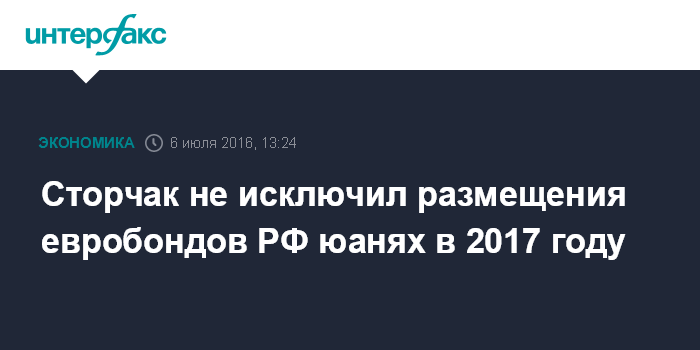 Москва. 6 июля. INTERFAX.RU - Шанс на размещение Россией бондов в юанях есть в 2017 году, полагает замминистра финансов РФ Сергей Сторчак.