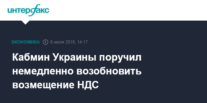 Москва. 6 июля. INTERFAX.RU - Премьер-министр Владимир Гройсман поручил Государственной фискальной службе (ГФС) немедленно передать Госказначейству реестр на возмещение налога на добавленную стоимость (НДС) и возобновить возмещение этого налога, прерванное в июне этого года.