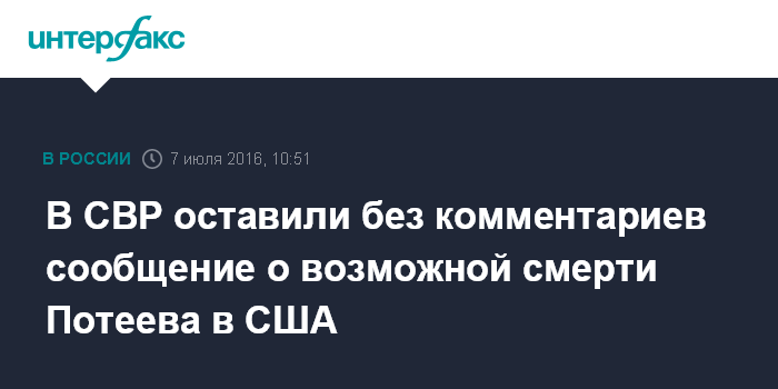 Москва. 7 июля. INTERFAX.RU - В Службе внешней разведки (СВР) РФ не комментируют сообщение о смерти в США перебежчика, экс-полковника российской разведки Александра Потеева.