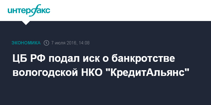 ЦБ РФ подал иск о банкротстве вологодской НКО "КредитАльянс"