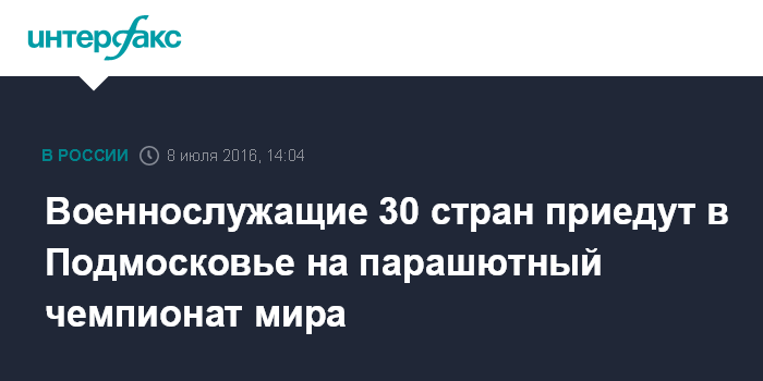 Москва. 8 июля. INTERFAX.RU - Военнослужащие более 30 стран примут участие в чемпионате мира по парашютному спорту, который пройдет в июле в подмосковной Кубинке, сообщили "Интерфаксу" в управлении пресс-службы и информации Минобороны РФ.