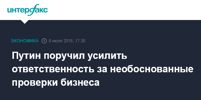 Москва. 8 июля. INTERFAX.RU - Президент РФ Владимир Путин поручил подготовить предложения, касающиеся усиления ответственности сотрудников правоохранительных органов за совершение действий, приведших к необоснованному уголовному преследованию предпринимателей и прекращению ими хозяйственной деятельности.